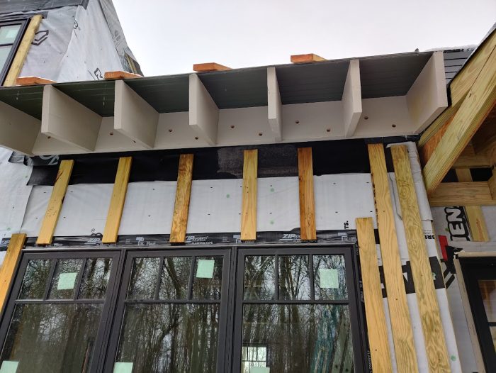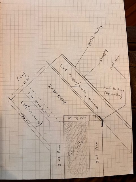 What I would like to do is have a complete thermal envelope of the house where the ICF walls, gable end walls, and roof sheathing create the envelope. I read an article about a house being built this way and watched an accompanying YouTube video a while back but I didnt save it and I can not find it for the life of me now. But basically they used Zip Sheathing which came right to the corner of the ICF zero overhang on gable or eave walls. All seams were taped and everything was insulated inside to create a super tight thermal envelope. Then above that 2x4s were placed on edge (with long timberlocks down into the rafters through the zip) to create both an air gap and the overhang framing for proper overhangs.